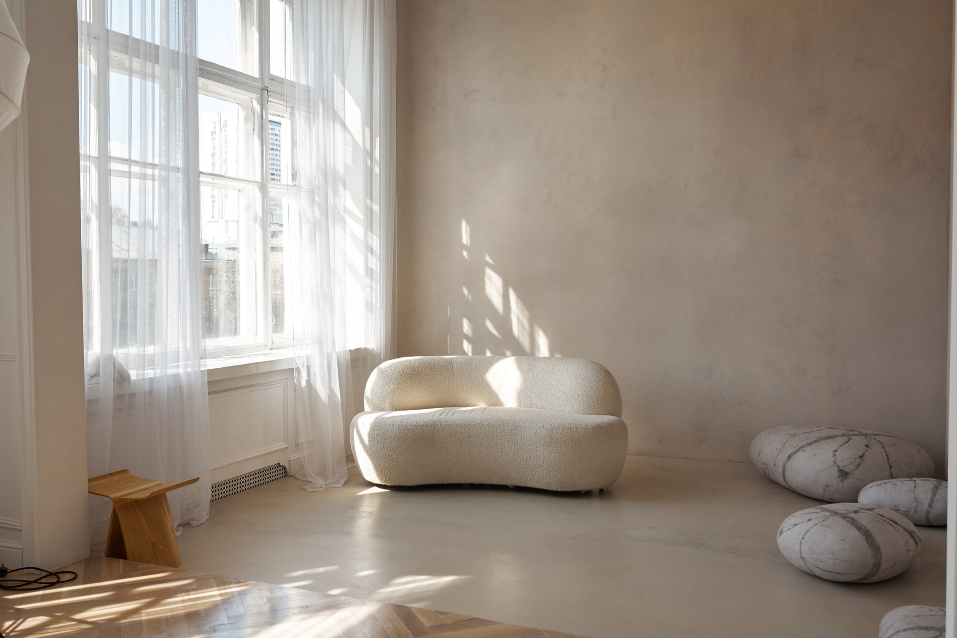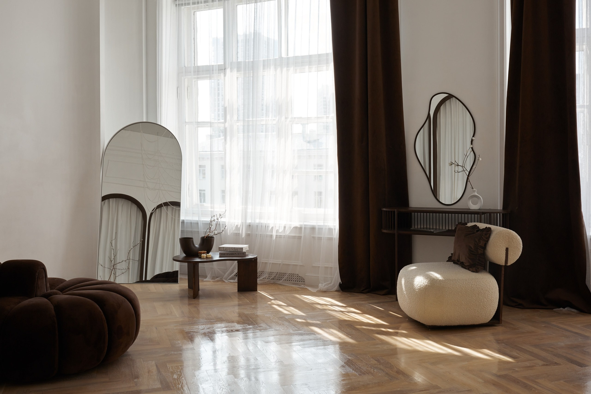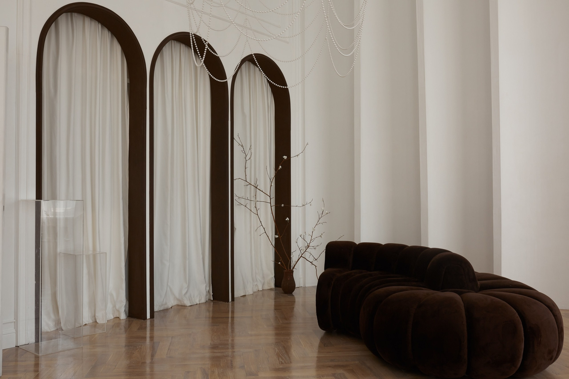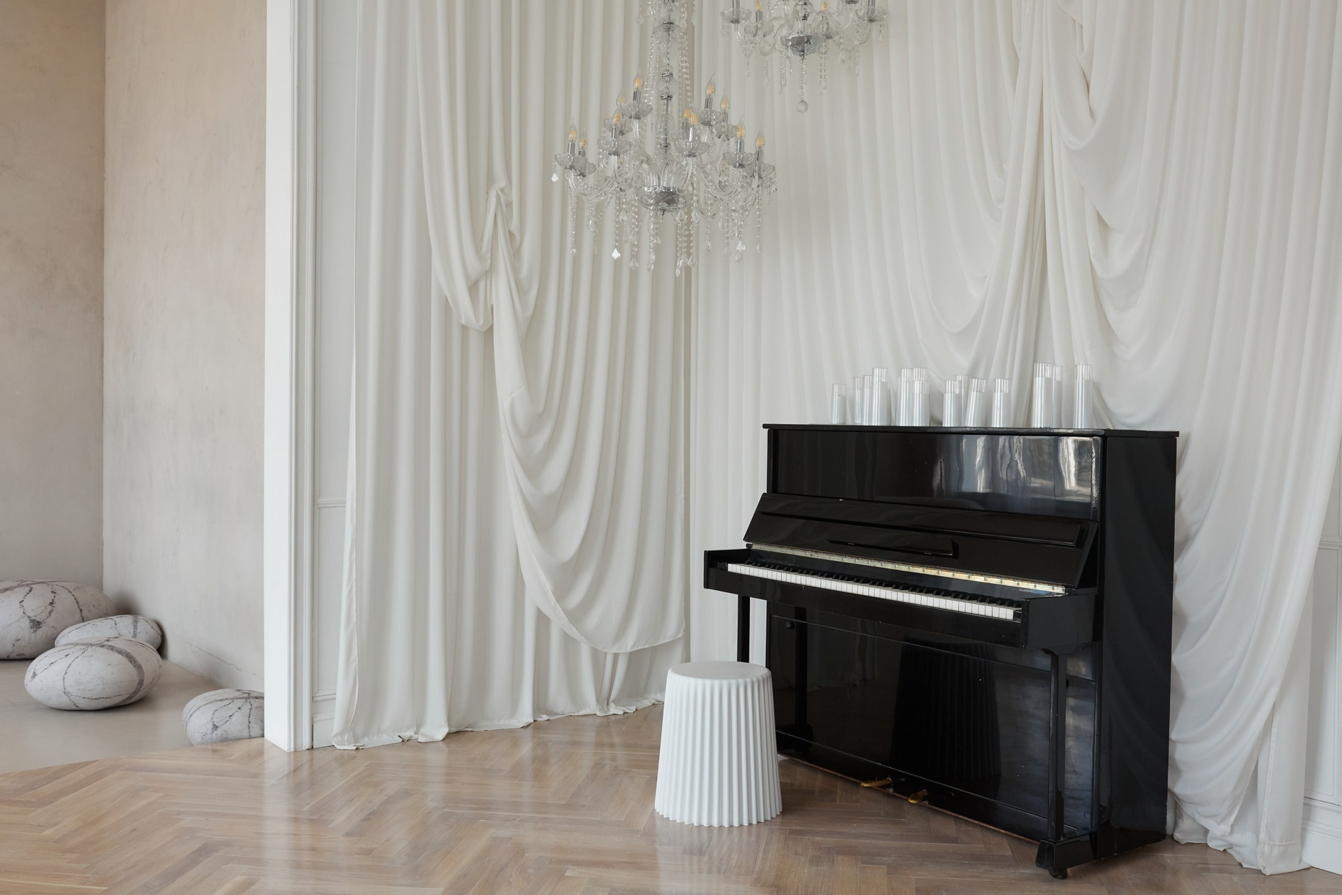 Светлый зал, состоящий из двух частей. Одна локация — в черно-белых тонах, с шикарными хрустальными люстрами. Вторая — минималистичная с натуральными тканями и материалами. Подходит для индивидуальных съемок и съемок небольшой семьи.